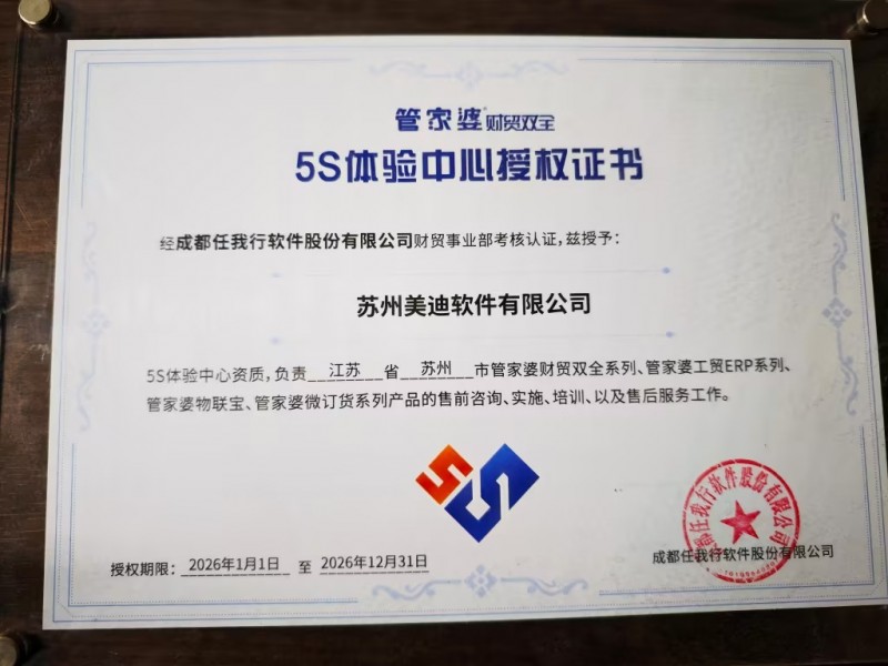 5S体验中心资质,负责江苏省苏州市管家婆财贸双全系列、管家婆工贸ERP系列、